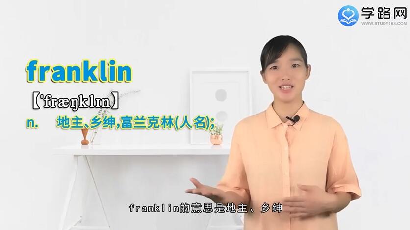 例如,Frankin University,富兰克林大学,Franklin island,富兰克林岛,还有我们所知道的用作人名的,美国的政治家,Benjamin Franklin,以及美国的总统,Franlkin Roosevelt,我们来用这个单词造一个句子,Politics fascinated Franklin's father,政治让富兰克林的父亲着迷,在这个句子中,翻译成人名富兰克林,而在下面这个句子中,He is a franklin in the countryside,他是这个村子里面的地主,franklin作为名词,翻译成地主,Franklin这个单词你学会了吗?