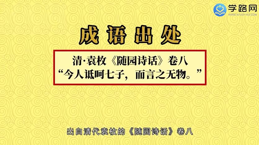 【言】的意思是言语、言辞,【物】指的是内容,成语的意思是说文章或言论空洞,没有实际内容,出自清代袁枚的《随园诗话》卷八:“今人诋呵七子,而言之无物。”意思是说,现在的人都在诋毁七子,却丝毫不知真情,这是一个贬义词,一般可以用作谓语、定语,例如毛主席在《反对党八股》中这样写道:“空话连篇言之无物的演说,是必须停止的。”